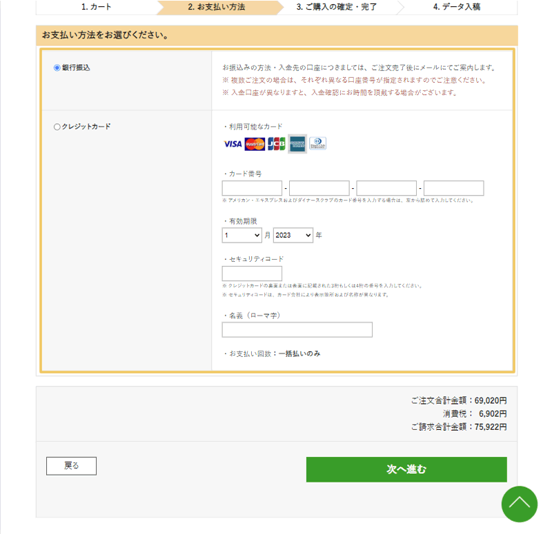 - お支払方法は、「クレジットカード決済」か「銀行振込」のいすれかをご選択ください。