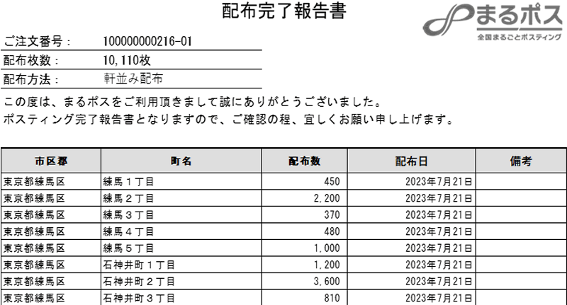 ポスティングが完了しましたら、「ポスティング完了のお知らせ」メールを送信いたします。あわせて「配布日」・「配布エリア」・「配布枚数」をまとめた報告書を送付いたします。報告書は、マイページ > 注文詳細 > ダウンロード(PDFファイル)からご確認頂けます。