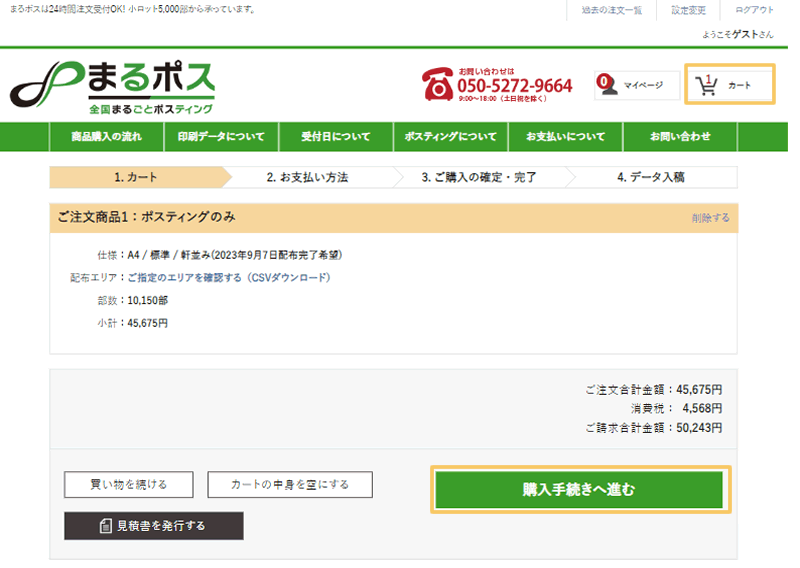 ポスティングのご希望条件の入力・選択が終わりましたら、、「配布完了希望日」・「配布部数」・「合計金額」を確認し、「カートに入れる」をクリックします。